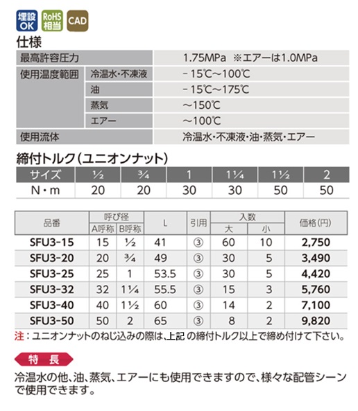 【ユニオンにオーリングを採用、低トルクで高いシール性能と施工性を実現】